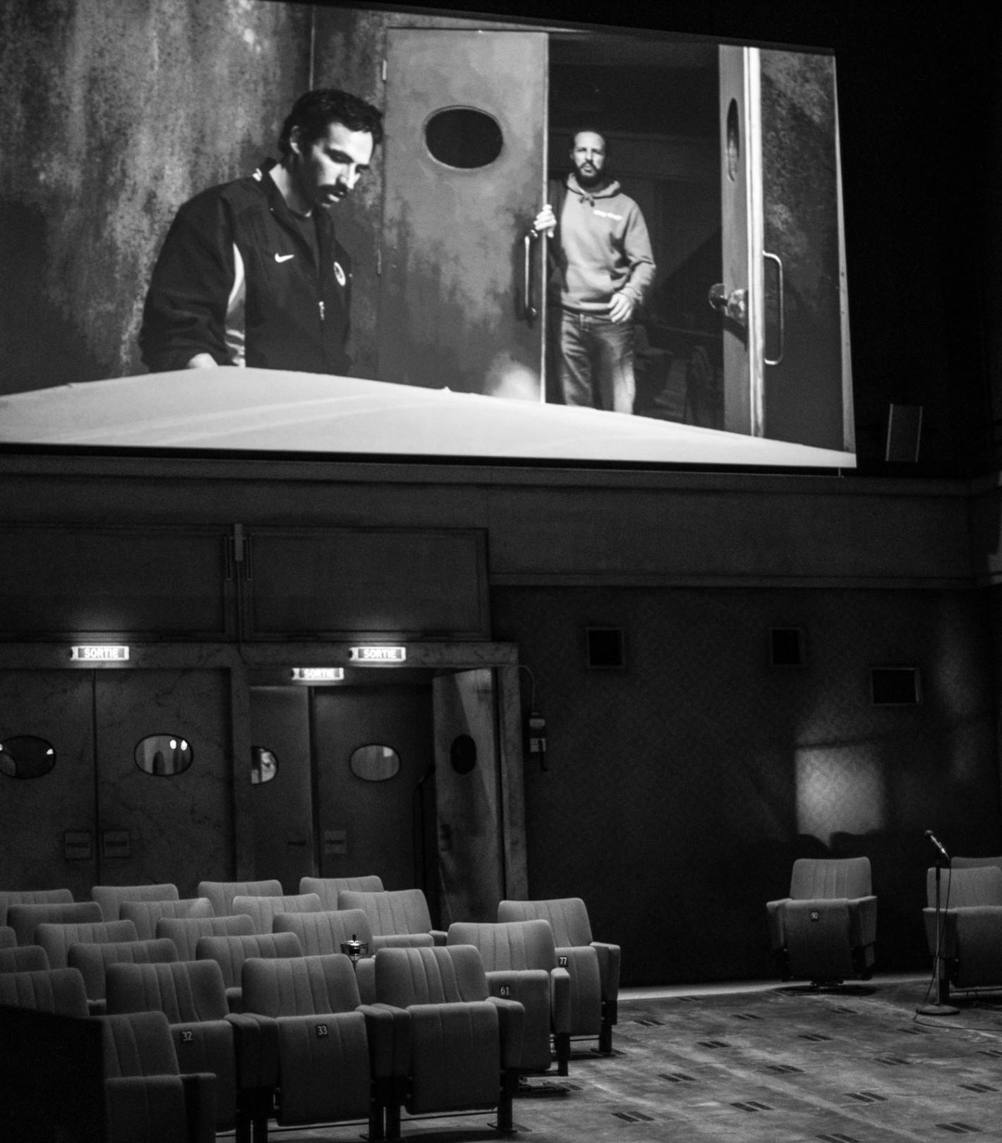Un cinéma abandonné. Les fauteuils ont disparu, la moquette a été arrachée. Un groupe de personnes s’est installé là. Elles semblent vivre dans ce lieu comme dans un abri. Elles s’adressent directement à nous, elles sont décidées à nous raconter un film. Elles le racontent dans le détail, elles s’efforcent d’être le plus exact possible, le plus proche du montage, des choix de mise en scène. Elles rejouent certaines scènes, certaines musiques. Le film en question s’intitule « Le Ciel de Nantes ». C’est un film imaginaire, un film sur ma famille que je ne me suis jamais décidé à tourner. Les personnages présents sur le plateau sont ma grand-mère, mes tantes, mes oncles, ma mère et moi. Ils ont un avis sur ce film fantôme. Il semble que leur vérité ne soit pas la mienne.