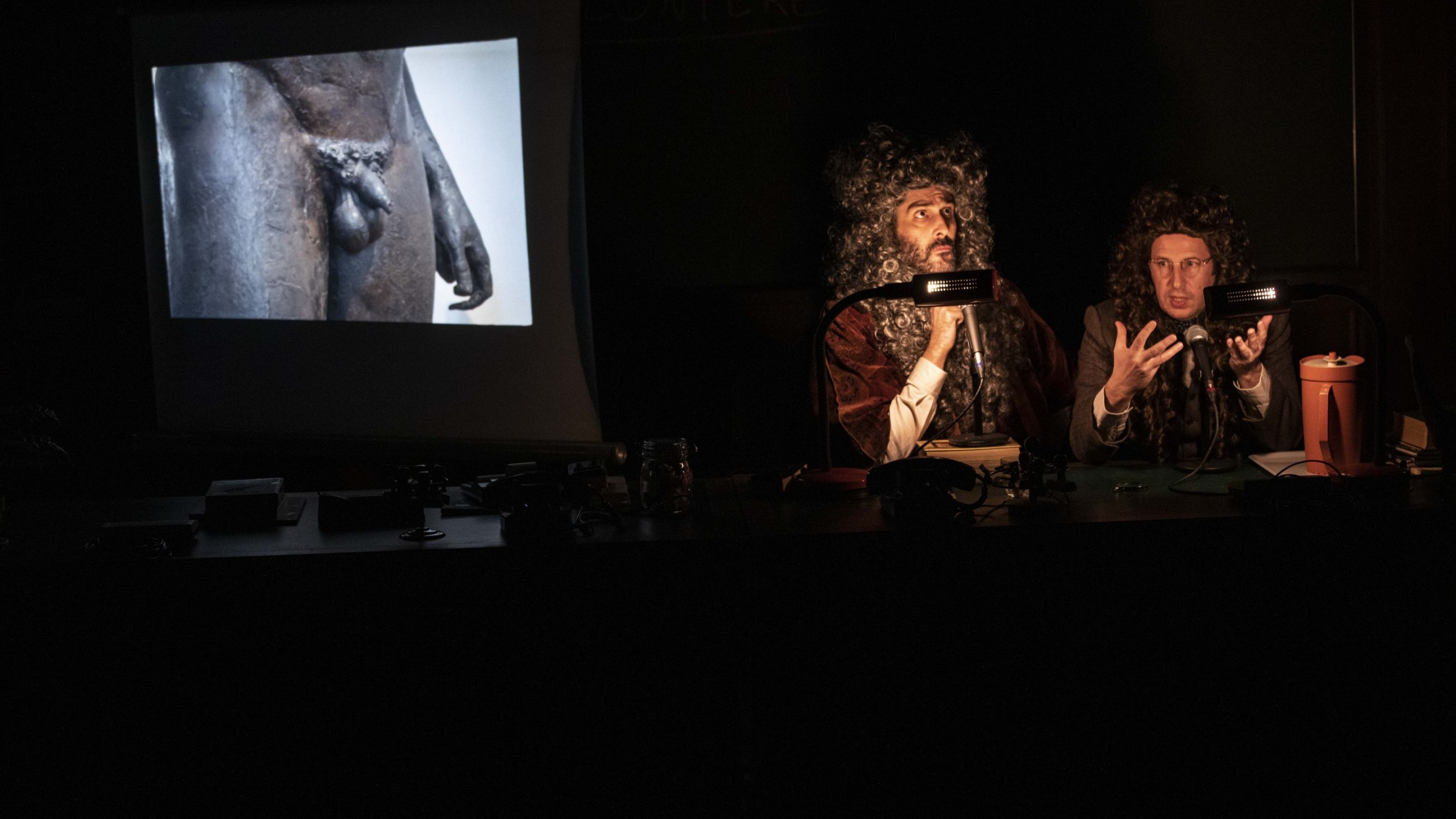 Sur scène, deux hommes sans âge qui prétendent être là depuis toute éternité et avoir très bien connu tous les personnages historiques dont ils brodent leurs discours. Ils sont péremptoires, autoritaires, paternalistes et ont décidé d’utiliser le temps de la représentation pour refaire urgemment l’éducation du public d’enfants qui leur fait face. Leurs sermons sont exagérés, ridicules, provocateurs. Plus ils affirment savoir, moins on les croit. Et se met alors à régner une irrésistible envie de les contredire, de les faire taire.